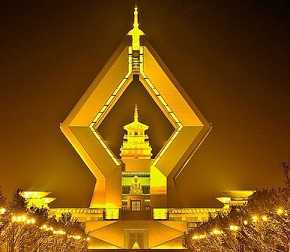 “法门寺合十舍利塔”由台湾著名建筑设计大师李祖原策划设计,呈双手合十状,塔高一百四十八米,相当于五十层楼高,中间有安放佛指舍利的宝塔型建筑,舍利塔前面有一条长达一千五百米的“佛光大道”,两旁用花岗石雕刻巨大的佛像。舍利塔总投资超过五十亿人民币。 据佛典记载,释迦牟尼涅盘时,弟子从其遗体灰烬中拣出1块头顶骨、2块肩胛骨、4颗牙齿、1节中指指骨和众多珠状舍利子。唐代时,这枚指骨舍利被6次迎请至皇宫供奉。公元874年,在最后一次迎请供奉后,这枚舍利被密封珍藏于陕西法门寺塔下地宫中,直到1987年秋文物工作者在清理佛塔废墟时重新发现。