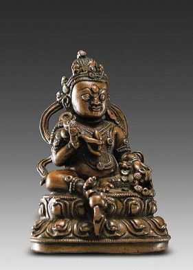 黄财神又名黄布禄金刚,是藏传佛教各大教派普遍供养的五姓财神之一,为北方司财众部之首,掌诸宝库,为众财神之首。其形象一面二臂,面慈目善,头戴佛冠,坦胸露腹,身小肚大,双臂劲力。