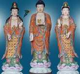 正确的西方三圣佛像摆放方法:中间是阿弥陀佛,左胁观世音菩萨,右胁大势至菩萨(此处的左和右是按照阿弥陀佛的左手边和右手边)